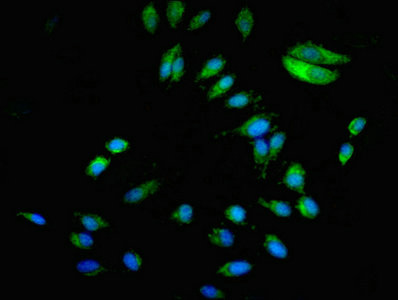 • Immunofluorescent analysis of Hela cells using CSB-PA002593LA01HU at dilution of 1:100 and Alexa Fluor 488-congugated AffiniPure Goat Anti-Rabbit IgG(H+L)