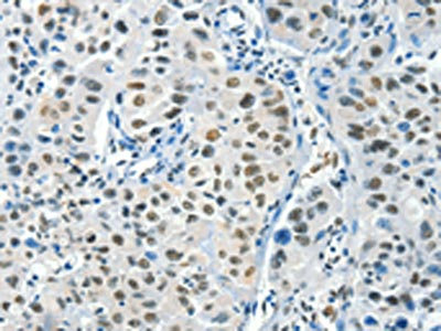The image on the left is immunohistochemistry of paraffin-embedded Human lung cancer tissue using CSB-PA594692(BCAS2 Antibody) at dilution 1/50, on the right is treated with fusion protein. (Original magnification: ×200)