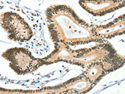 The image on the left is immunohistochemistry of paraffin-embedded Human colon cancer tissue using CSB-PA594692(BCAS2 Antibody) at dilution 1/50, on the right is treated with fusion protein. (Original magnification: ×200)