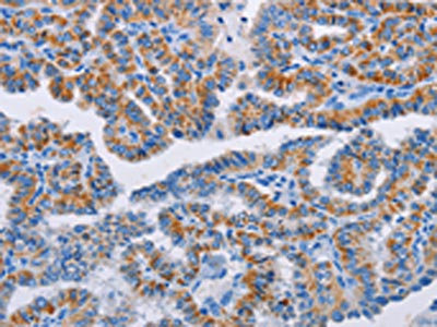 The image on the left is immunohistochemistry of paraffin-embedded Human thyroid cancer tissue using CSB-PA561279(BCL2A1 Antibody) at dilution 1/20, on the right is treated with fusion protein. (Original magnification: ×200)