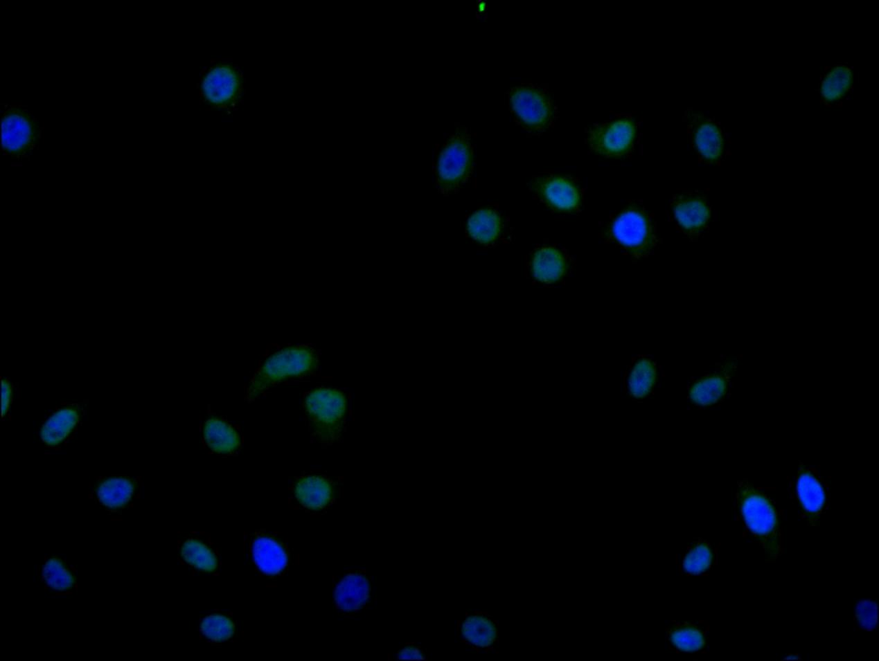 Immunofluorescence staining of A549 cell with CSB-PA002623LA01HU at 1:30, counter-stained with DAPI. The cells were fixed in 4% formaldehyde and blocked in 10% normal Goat Serum. The cells were then incubated with the antibody overnight at 4C. The secondary antibody was Alexa Fluor 488-congugated AffiniPure Goat Anti-Rabbit IgG(H+L).