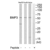 • Western blot analysis of extracts from HeLa cells, HuvEc cells and HepG2 cells, using BMP3 antibody.