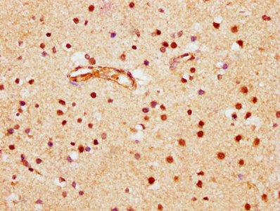 IHC image of CSB-PA002799LA01HU diluted at 1:600 and staining in paraffin-embedded human brain tissue performed on a Leica BondTM system. After dewaxing and hydration, antigen retrieval was mediated by high pressure in a citrate buffer (pH 6.0). Section was blocked with 10% normal goat serum 30min at RT. Then primary antibody (1% BSA) was incubated at 4°C overnight. The primary is detected by a biotinylated secondary antibody and visualized using an HRP conjugated SP system.
