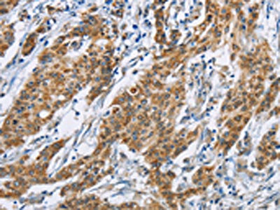 • The image on the left is immunohistochemistry of paraffin-embedded Human gastric cancer tissue using CSB-PA921825(BTLA Antibody) at dilution 1/30, on the right is treated with fusion protein. (Original magnification: ×200)