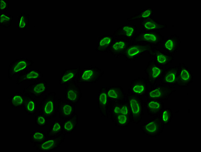 • Immunofluorescence staining of Hela cells (treated with 30mM sodium butyrate for 4h) with CSB-PA010403OA20butHU at 1:15, counter-stained with DAPI. The cells were fixed in 4% formaldehyde, permeabilized using 0.2% Triton X-100 and blocked in 10% normal Goat Serum. The cells were then incubated with the antibody overnight at 4°C. The secondary antibody was Alexa Fluor 488-congugated AffiniPure Goat Anti-Rabbit IgG(H+L).