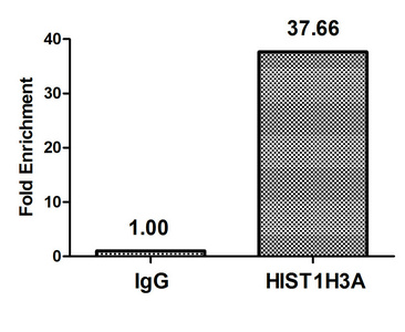 Chromatin Immunoprecipitation Hela (106, treated with 30mM sodium butyrate for 4h) were treated with Micrococcal Nuclease, sonicated, and immunoprecipitated with 5µg anti-HIST1H3A (CSB-PA010418OA27butHU) or a control normal rabbit IgG. The resulting ChIP DNA was quantified using real-time PCR with primers against the β-Globin promoter.