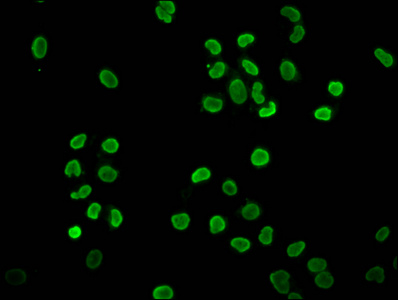 Immunofluorescence staining of Hela cells (treated with 30mM sodium butyrate for 4h) with CSB-PA010429OA12butHU at 1:75, counter-stained with DAPI. The cells were fixed in 4% formaldehyde, permeabilized using 0.2% Triton X-100 and blocked in 10% normal Goat Serum. The cells were then incubated with the antibody overnight at 4°C. The secondary antibody was Alexa Fluor 488-congugated AffiniPure Goat Anti-Rabbit IgG(H+L).