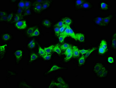 • Immunofluorescence staining of HepG2 cells with CSB-PA872527LA01HU at 1:333, counter-stained with DAPI. The cells were fixed in 4% formaldehyde, permeabilized using 0.2% Triton X-100 and blocked in 10% normal Goat Serum. The cells were then incubated with the antibody overnight at 4°C. The secondary antibody was Alexa Fluor 488-congugated AffiniPure Goat Anti-Rabbit IgG(H+L).