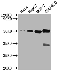 Positive WB detected in: Hela whole cell lysate, HepG2 whole cell lysate, MCF-7 whole cell lysate, COLO320 whole cell lysate