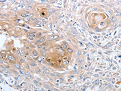 The image on the left is immunohistochemistry of paraffin-embedded Human esophagus cancer tissue using CSB-PA041334(CASP12 Antibody) at dilution 1/50, on the right is treated with synthetic peptide. (Original magnification: ×200)