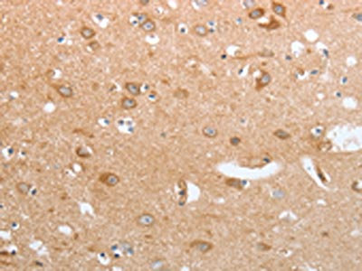 The image on the left is immunohistochemistry of paraffin-embedded Human brain tissue using CSB-PA041334(CASP12 Antibody) at dilution 1/50, on the right is treated with synthetic peptide. (Original magnification: ×200)