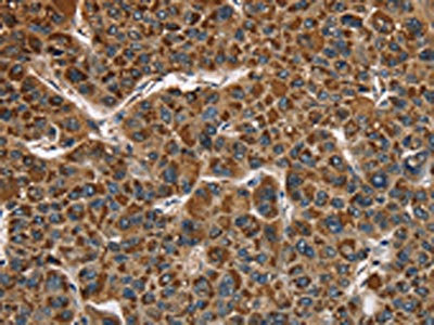 • The image on the left is immunohistochemistry of paraffin-embedded Human liver cancer tissue using CSB-PA599838(CAT Antibody) at dilution 1/40, on the right is treated with fusion protein. (Original magnification: ×200)