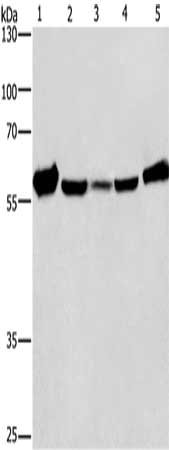• Gel: 8%SDS-PAGE, Lysate: 40 μg, Lane 1-5: Mouse liver tissue, Raji cells, hela cells, hepG2 cells, A549 cells, Primary antibody: CSB-PA599838(CAT Antibody) at dilution 1/266.6, Secondary antibody: Goat anti rabbit IgG at 1/8000 dilution, Exposure time: 20 seconds