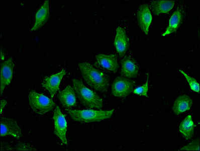 • Immunofluorescent analysis of A549 cells using CSB-PA004572LA01HU at dilution of 1:100 and Alexa Fluor 488-congugated AffiniPure Goat Anti-Rabbit IgG(H+L)