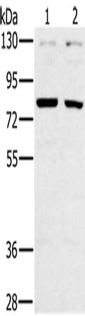 • Gel: 6%SDS-PAGE, Lysate: 40 μg, Lane 1-2: A549 cells, PC3 cells, Primary antibody: CSB-PA685145(CD44 Antibody) at dilution 1/500, Secondary antibody: Goat anti rabbit IgG at 1/8000 dilution, Exposure time: 1 minute