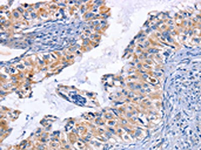 The image on the left is immunohistochemistry of paraffin-embedded Human cervical cancer tissue using CSB-PA074453(CD48 Antibody) at dilution 1/50, on the right is treated with synthetic peptide. (Original magnification: ×200)