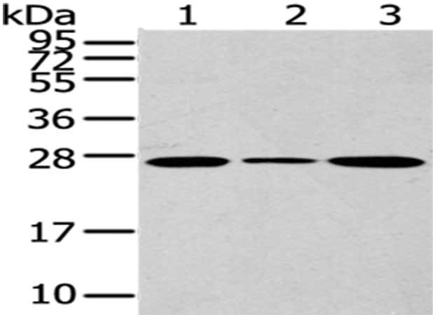 • Gel: 12%SDS-PAGE,Lysate: 40 μg,Lane 1-3: NIH/3T3 cells, K562 cells, 293T cells,Primary antibody: CSB-PA259468(CD63 Antibody) at dilution 1/200 dilution,Secondary antibody: Goat anti rabbit IgG at 1/8000 dilution,Exposure time: 20 seconds