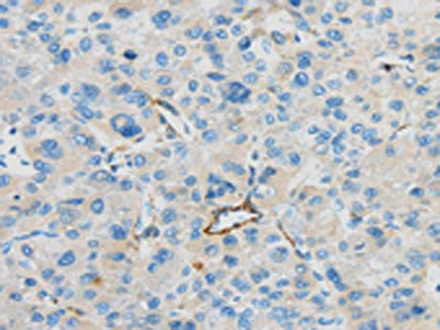 • The image on the left is immunohistochemistry of paraffin-embedded Human liver cancer tissue using CSB-PA120615(CD63 Antibody) at dilution 1/35, on the right is treated with synthetic peptide. (Original magnification: ×200)