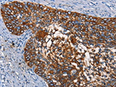 The image on the left is immunohistochemistry of paraffin-embedded Human cervical cancer tissue using CSB-PA282654(CD68 Antibody) at dilution 1/30, on the right is treated with synthetic peptide. (Original magnification: ×200)