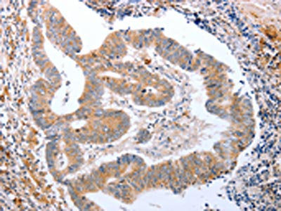 The image on the left is immunohistochemistry of paraffin-embedded Human colon cancer tissue using CSB-PA578796(CDK20 Antibody) at dilution 1/15, on the right is treated with fusion protein. (Original magnification: ×200)