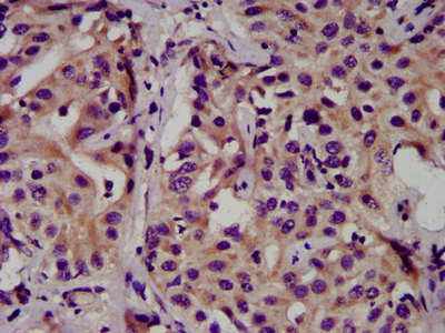 IHC image of CSB-PA005158LA01HU diluted at 1:500 and staining in paraffin-embedded human liver cancer performed on a Leica BondTM system. After dewaxing and hydration, antigen retrieval was mediated by high pressure in a citrate buffer (pH 6.0). Section was blocked with 10% normal goat serum 30min at RT. Then primary antibody (1% BSA) was incubated at 4°C overnight. The primary is detected by a biotinylated secondary antibody and visualized using an HRP conjugated SP system.