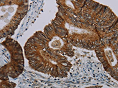 • The image on the left is immunohistochemistry of paraffin-embedded Human colon cancer tissue using CSB-PA877207(CFLAR Antibody) at dilution 1/20, on the right is treated with synthetic peptide. (Original magnification: ×200)