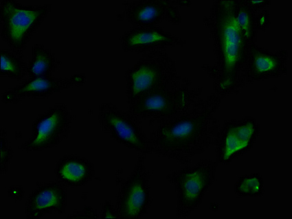 Immunofluorescence staining of U251 cells with CSB-PA005381PA01HU at 1:50,counter-stained with DAPI. The cells were fixed in 4% formaldehyde, permeabilized using 0.2% Triton X-100 and blocked in 10% normal Goat Serum. The cells were then incubated with the antibody overnight at 4°C.The secondary antibody was Alexa Fluor 488-congugated AffiniPure Goat Anti-Rabbit IgG (H+L).