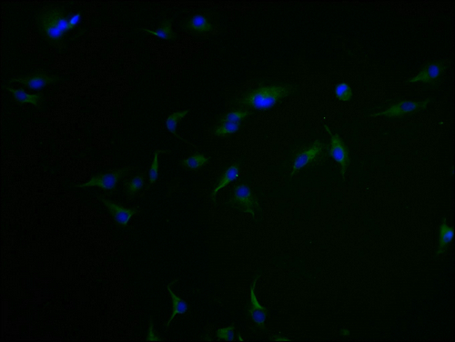 Immunofluorescence staining of Hela cells with CSB-PA005498LA01HU at 1:100, counter-stained with DAPI. The cells were fixed in 4% formaldehyde and blocked in 10% normal Goat Serum. The cells were then incubated with the antibody overnight at 4°C. The secondary antibody was Alexa Fluor 488-congugated AffiniPure Goat Anti-Rabbit IgG(H+L).