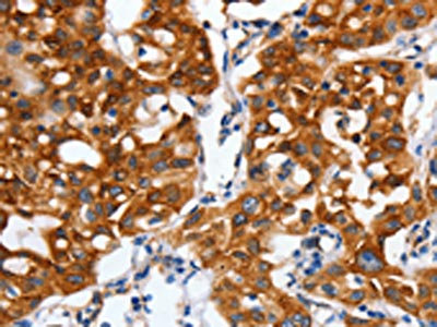 The image on the left is immunohistochemistry of paraffin-embedded Human lung cancer tissue using CSB-PA237804(CLDND1 Antibody) at dilution 1/60, on the right is treated with synthetic peptide. (Original magnification: ×200)