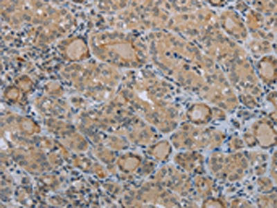The image on the left is immunohistochemistry of paraffin-embedded Human thyroid cancer tissue using CSB-PA100844(CLEC1A Antibody) at dilution 1/40, on the right is treated with fusion protein. (Original magnification: ×200)