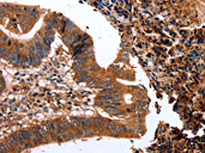 The image on the left is immunohistochemistry of paraffin-embedded Human colon cancer tissue using CSB-PA016840(CLEC4A Antibody) at dilution 1/15, on the right is treated with fusion protein. (Original magnification: ×200)