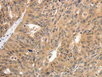 The image on the left is immunohistochemistry of paraffin-embedded Human ovarian cancer tissue using CSB-PA161346(CNNM3 Antibody) at dilution 1/25, on the right is treated with fusion protein. (Original magnification: ×200)
