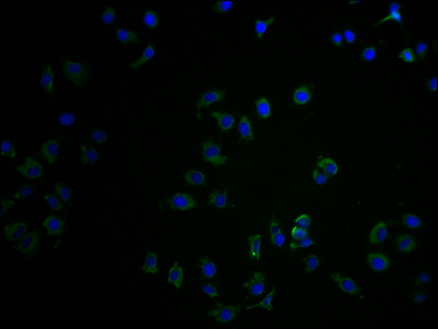 Immunofluorescence staining of A549 cells with CSB-PA822273LA01HU at 1:100, counter-stained with DAPI. The cells were fixed in 4% formaldehyde and blocked in 10% normal Goat Serum. The cells were then incubated with the antibody overnight at 4°C. The secondary antibody was Alexa Fluor 488-congugated AffiniPure Goat Anti-Rabbit IgG(H+L).