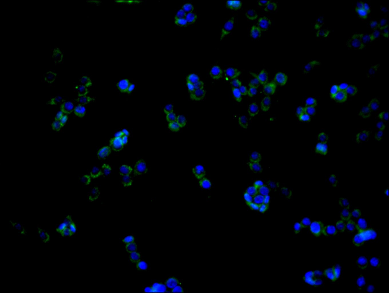 Immunofluorescence staining of RAW264.7 cell with CSB-PA005755LA01HU at 1:20, counter-stained with DAPI. The cells were fixed in 4% formaldehyde and blocked in 10% normal Goat Serum. The cells were then incubated with the antibody overnight at 4C. The secondary antibody was Alexa Fluor 488-congugated AffiniPure Goat Anti-Rabbit IgG(H+L).