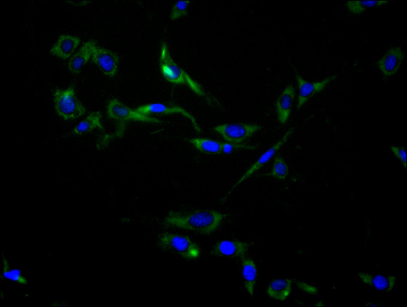 Immunofluorescence staining of NIH/3T3 cell with 5% goat serum, counter-stained with DAPI. The cells were fixed in 4% formaldehyde and blocked in 10% normal Goat Serum. The cells were then incubated with the antibody overnight at 4C. The secondary antibody was Alexa Fluor 488-congugated AffiniPure Goat Anti-Rabbit IgG(H+L).