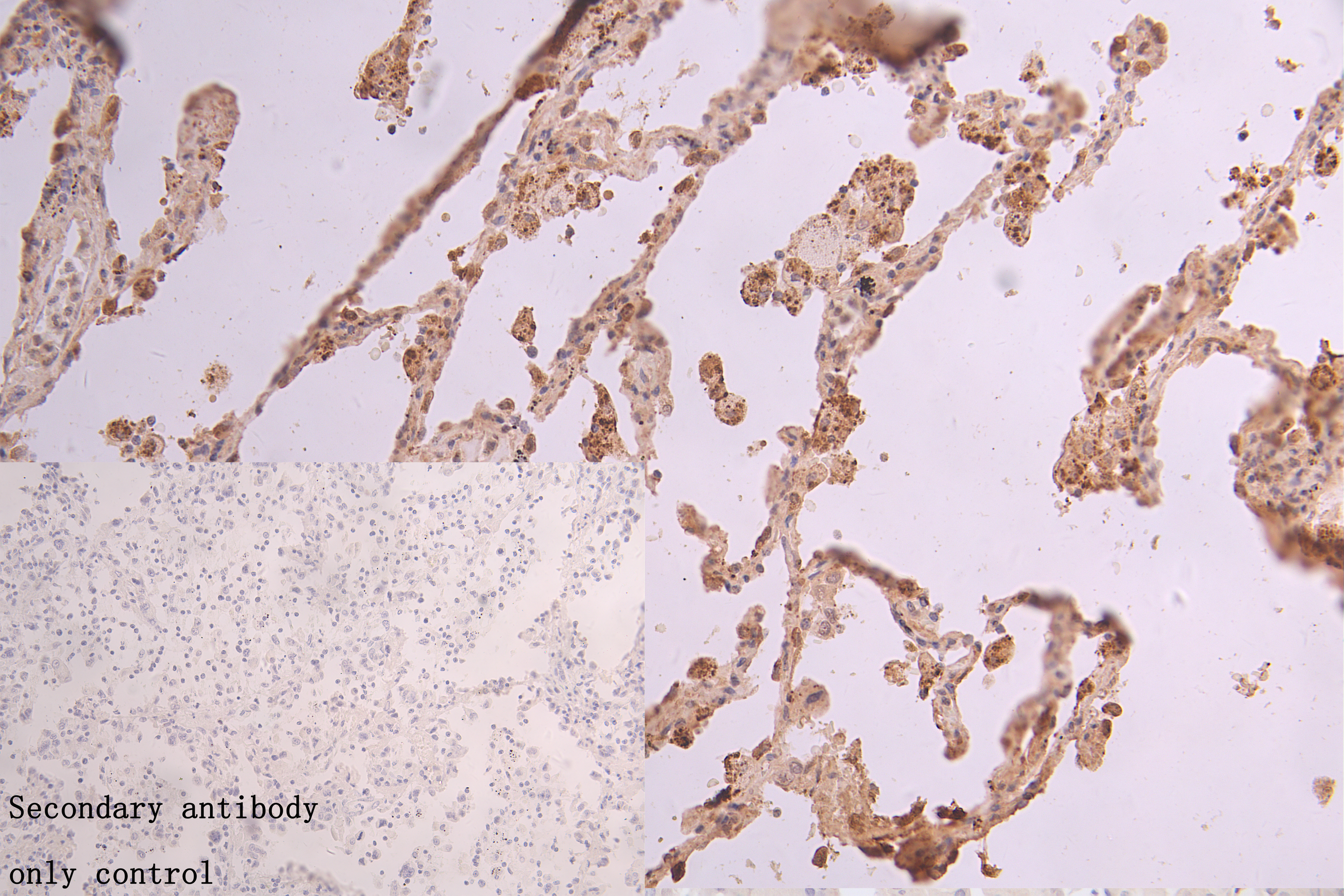 IHC image of CSB-PA005755LA01HU diluted at 1:67 and staining in paraffin-embedded human lung cancer performed on a Leica BondTM system. After dewaxing and hydration, antigen retrieval was mediated by high pressure in a citrate buffer (pH 6.0). Section was blocked with 10% normal goat serum 30min at RT. Then primary antibody (1% BSA) was incubated at 4°C overnight. The primary is detected by a Goat anti-rabbit polymer IgG labeled by HRP and visualized using 0.05% DAB. Secondary antibody only control: uses 1% BSA instead of primary antibody