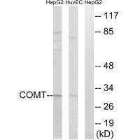 • Western blot analysis of extracts from HepG2 cells and HUVEC cells, using COMT antibody.