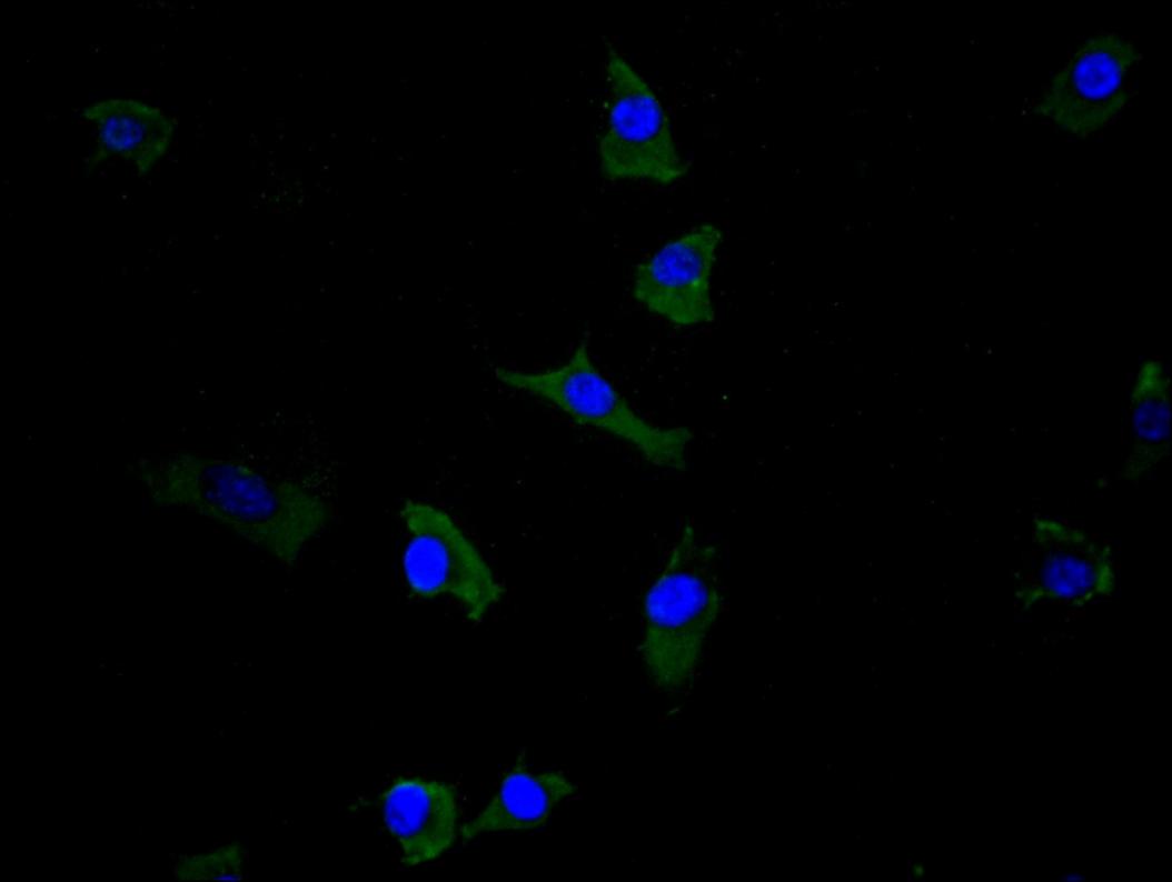 Immunofluorescence staining of SH-SY5Y cell with 5% goat serum, counter-stained with DAPI. The cells were fixed in 4% formaldehyde and blocked in 10% normal Goat Serum. The cells were then incubated with the antibody overnight at 4C. The secondary antibody was Alexa Fluor 488-congugated AffiniPure Goat Anti-Rabbit IgG(H+L).