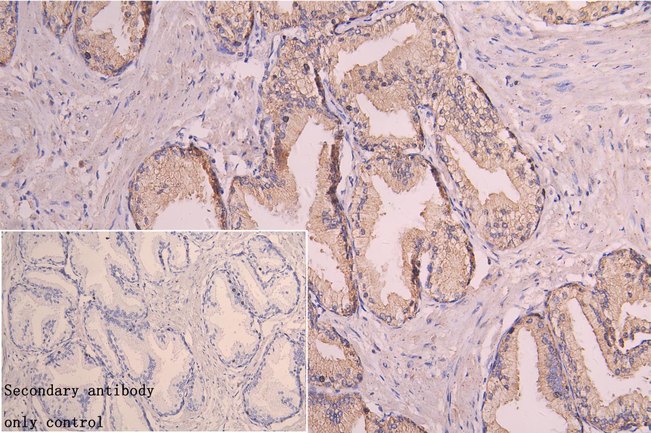 IHC image of CSB-PA896913ESR1HU diluted at 1:150 and staining in paraffin-embedded Human prostate cancer performed on a Leica BondTM system. After dewaxing and hydration, antigen retrieval was mediated by high pressure in a citrate buffer (pH 6.0). Section was blocked with 10% normal goat serum 30min at RT. Then primary antibody (1% BSA) was incubated at 4°C overnight. The primary is detected by a Goat anti-rabbit polymer IgG labeled by HRP and visualized using 0.05% DAB.