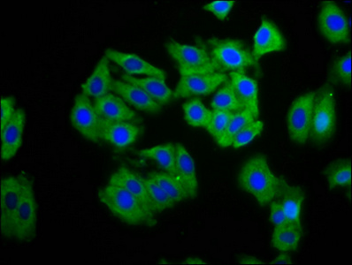 Immunofluorescence staining of HepG2 cells with CSB-PA005909LA01HU at 1:100, counter-stained with DAPI. The cells were fixed in 4% formaldehyde, permeabilized using 0.2% Triton X-100 and blocked in 10% normal Goat Serum. The cells were then incubated with the antibody overnight at 4°C. The secondary antibody was Alexa Fluor 488-congugated AffiniPure Goat Anti-Rabbit IgG(H+L).