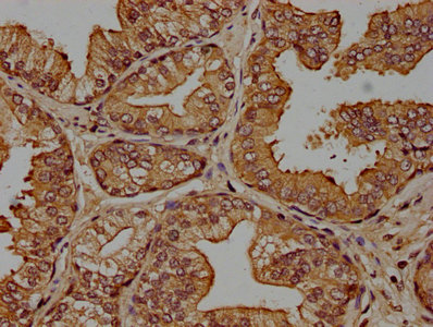 • IHC image of CSB-PA005963OA01HU diluted at 1:100 and staining in paraffin-embedded human prostate cancer performed on a Leica BondTM system. After dewaxing and hydration, antigen retrieval was mediated by high pressure in a citrate buffer (pH 6.0). Section was blocked with 10% normal goat serum 30min at RT. Then primary antibody (1% BSA) was incubated at 4°C overnight. The primary is detected by a biotinylated secondary antibody and visualized using an HRP conjugated SP system.