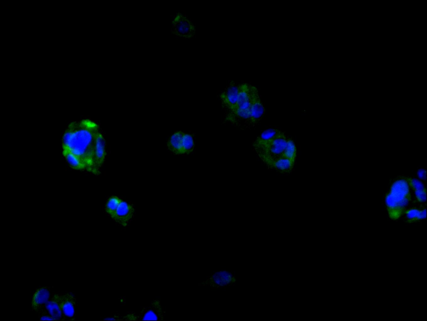 • Immunofluorescence staining of HepG2 cell with CSB-PA623797LA01HU at 1:20, counter-stained with DAPI. The cells were fixed in 4% formaldehyde and blocked in 10% normal Goat Serum. The cells were then incubated with the antibody overnight at 4C. The secondary antibody was Alexa Fluor 488-congugated AffiniPure Goat Anti-Rabbit IgG(H+L).