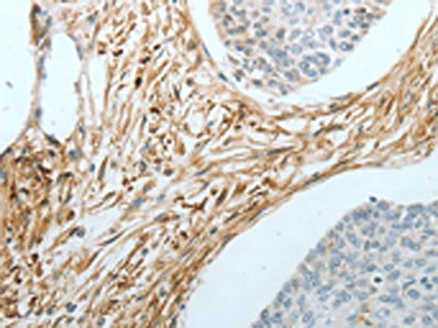 The image on the left is immunohistochemistry of paraffin-embedded Human cervical cancer tissue using CSB-PA161781(CRMP1 Antibody) at dilution 1/20, on the right is treated with fusion protein. (Original magnification: ×200)