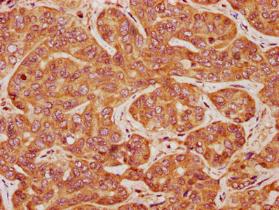 IHC image of CSB-PA747623LA01HU diluted at 1:500 and staining in paraffin-embedded human liver cancer performed on a Leica BondTM system. After dewaxing and hydration, antigen retrieval was mediated by high pressure in a citrate buffer (pH 6.0). Section was blocked with 10% normal goat serum 30min at RT. Then primary antibody (1% BSA) was incubated at 4°C overnight. The primary is detected by a biotinylated secondary antibody and visualized using an HRP conjugated SP system.