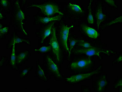 Immunofluorescence staining of U251 cells with CSB-PA006008HA01HU at 1:66, counter-stained with DAPI. The cells were fixed in 4% formaldehyde, permeabilized using 0.2% Triton X-100 and blocked in 10% normal Goat Serum. The cells were then incubated with the antibody overnight at 4°C. The secondary antibody was Alexa Fluor 488-congugated AffiniPure Goat Anti-Rabbit IgG(H+L).