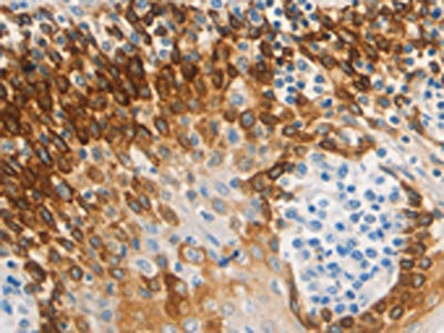 The image on the left is immunohistochemistry of paraffin-embedded Human esophagus cancer tissue using CSB-PA174940(CSF3 Antibody) at dilution 1/15, on the right is treated with synthetic peptide. (Original magnification: ×200)