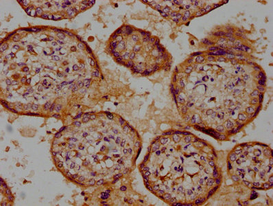 IHC image of CSB-PA006056LA01HU diluted at 1:100 and staining in paraffin-embedded human placenta tissue performed on a Leica BondTM system. After dewaxing and hydration, antigen retrieval was mediated by high pressure in a citrate buffer (pH 6.0). Section was blocked with 10% normal goat serum 30min at RT. Then primary antibody (1% BSA) was incubated at 4°C overnight. The primary is detected by a biotinylated secondary antibody and visualized using an HRP conjugated SP system.