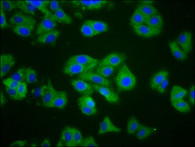 Immunofluorescence staining of HepG2 cells with CSB-PA836295LA01HU at 1:200, counter-stained with DAPI. The cells were fixed in 4% formaldehyde, permeabilized using 0.2% Triton X-100 and blocked in 10% normal Goat Serum. The cells were then incubated with the antibody overnight at 4°C. The secondary antibody was Alexa Fluor 488-congugated AffiniPure Goat Anti-Rabbit IgG(H+L).