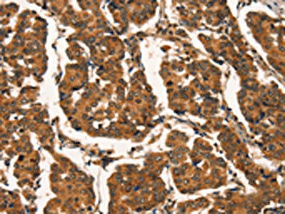 The image on the left is immunohistochemistry of paraffin-embedded Human breast cancer tissue using CSB-PA556194(CTNNBIP1 Antibody) at dilution 1/20, on the right is treated with fusion protein. (Original magnification: ×200)
