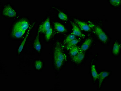 Immunofluorescence staining of Hela cells with CSB-PA873651LA01HU at 1:133, counter-stained with DAPI. The cells were fixed in 4% formaldehyde, permeabilized using 0.2% Triton X-100 and blocked in 10% normal Goat Serum. The cells were then incubated with the antibody overnight at 4°C. The secondary antibody was Alexa Fluor 488-congugated AffiniPure Goat Anti-Rabbit IgG(H+L).